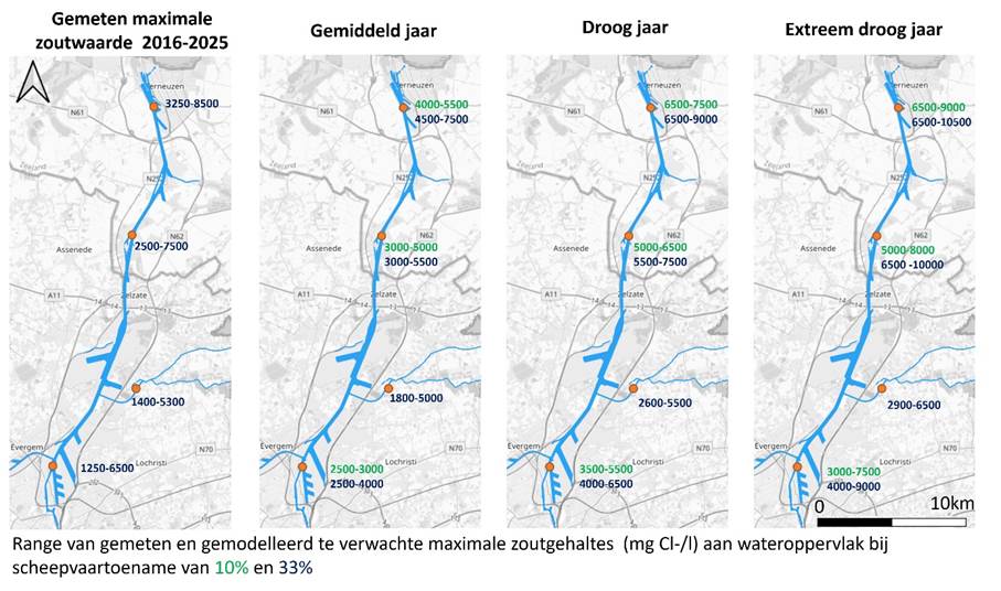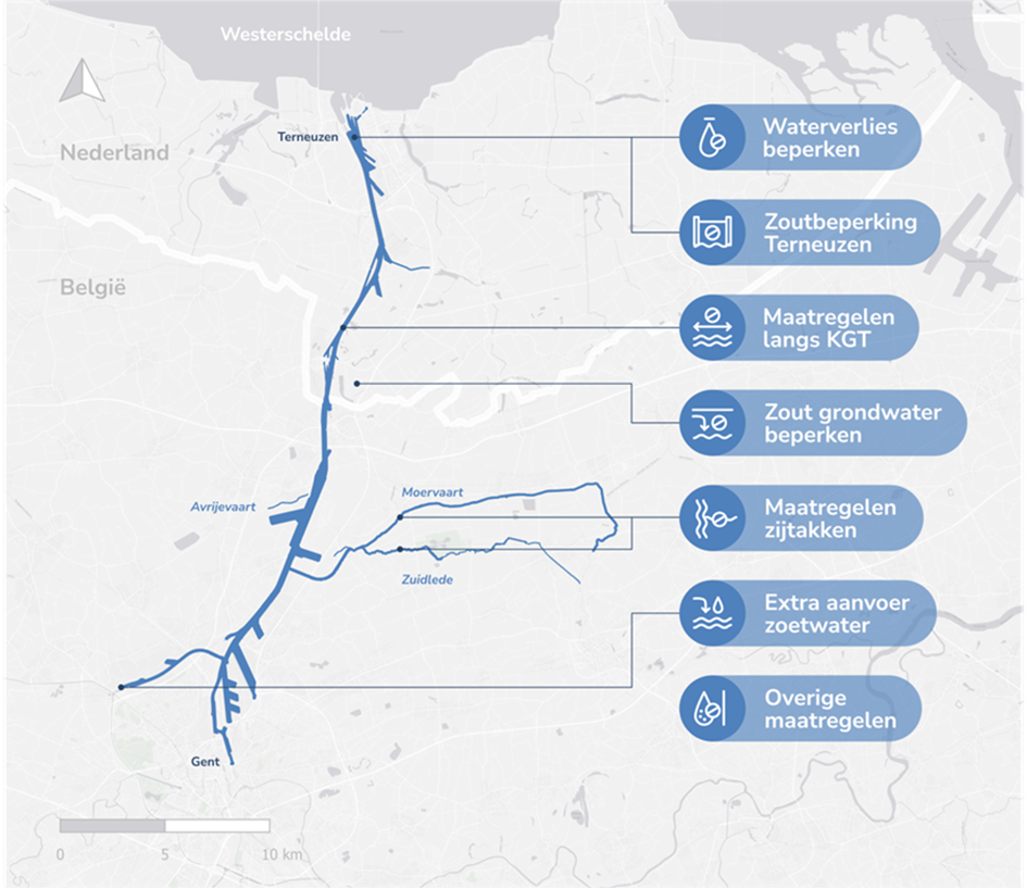 Maatregelen langs KGT: Ook in het kanaal zelf kunnen maatregelen genomen worden om de verspreiding van het zout vanaf benedenstrooms (bij Terneuzen) richting bovenstrooms (richting Gent) te beperken. Dit kan bijvoorbeeld door de menging te verbeteren, waardoor het zout makkelijker weggespoeld kan worden.